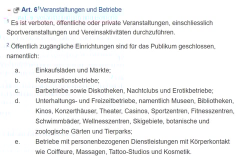 Aufgrund der Bundes-Massnahmen zur Eindämmung von Covid-19 sind viele Branchen mit erheblichen Einschränkungen ihrer Tätigkeit konfrontiert. Seit Erlass der Verordnung 2 vom 16. März 2020 sind beispielsweise Gastronomiebetriebe, Coiffeursalons und sämtliche Freizeitbetriebe geschlossen: